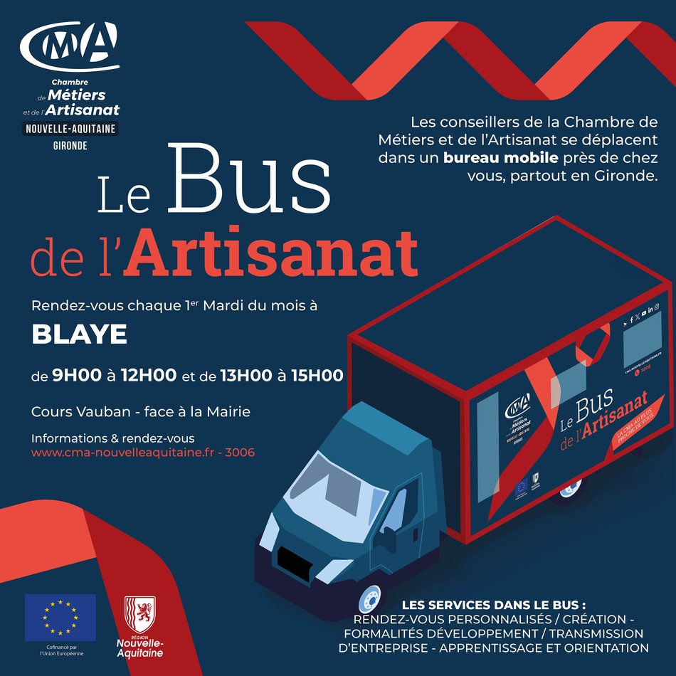 🎨🚌 Le Bus de l’artisanat est de retour cet automne sur le territoire de la Communauté de Communes de Blaye ! Mis en place par la Chambre des Métiers et de l’Artisanat de Gironde, il sillonne les routes à la rencontre des artisans et des futurs apprentis 💬 Chaque 1ᵉʳ mardi du mois, de 9h à 12h et de 13h à 15h, rendez-vous à Blaye (Cours Vauban, face à la mairie) 🏛️